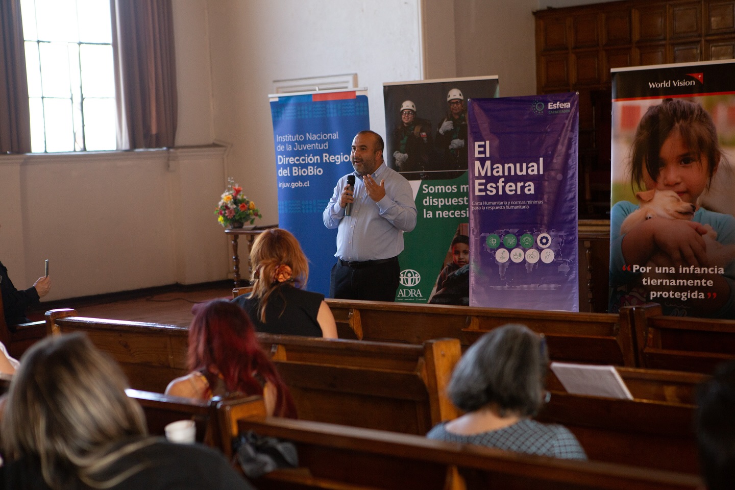 Desde ADRA participaron su director Diego Trincado y especialistas provenientes de Santiago y Valparaíso, sumándose además la organización ESFERA, que inicia labores en Chile. La Cruz Roja estuvo representada por su directora regional Rosa Barrera y un equipo de capacitadores del Biobío. Por su parte, World Vision participó con Vanessa Carrillo y su equipo regional.