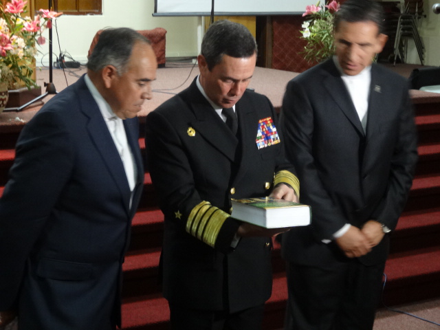 El culto realizado en la Iglesia Asambleas de Dios de Valparaíso, estuvo marcado por los himnos entonados por los grumetes de la banda instrumental de Marina y el mensaje bíblico quedó a cargo del capellán Nacional Evangélico René Ojeda, quien hizo hincapié en la importancia de mirar a Dios por sobre todas las cosas y trabajar cada día para alcanzar una salvación eterna, argumentando que “los cristianos muchas veces pierden el camino en los afanes diarios, pero que sin duda alguna si miran el rostro de Dios y descansan en él, sus vidas tendrán un sentido mucho mayor” además enfatizó es muy importante que nuestras autoridades confíen en nuestro Señor y esperen en su voluntad, eso hace de Chile un país mas gran en todos los sentidos” Ojeda agradeció además, el tremendo apoyo que siempre ha recibido de parte de la máxima autoridad de la Armada, el Almirante Edmundo Gonzales Robles, a quien durante el culto le entregó una biblia como presente, remarcando en ello la estima que tienen por su persona y bendiciendo su vida, en este que será el año de retiro de la institución.