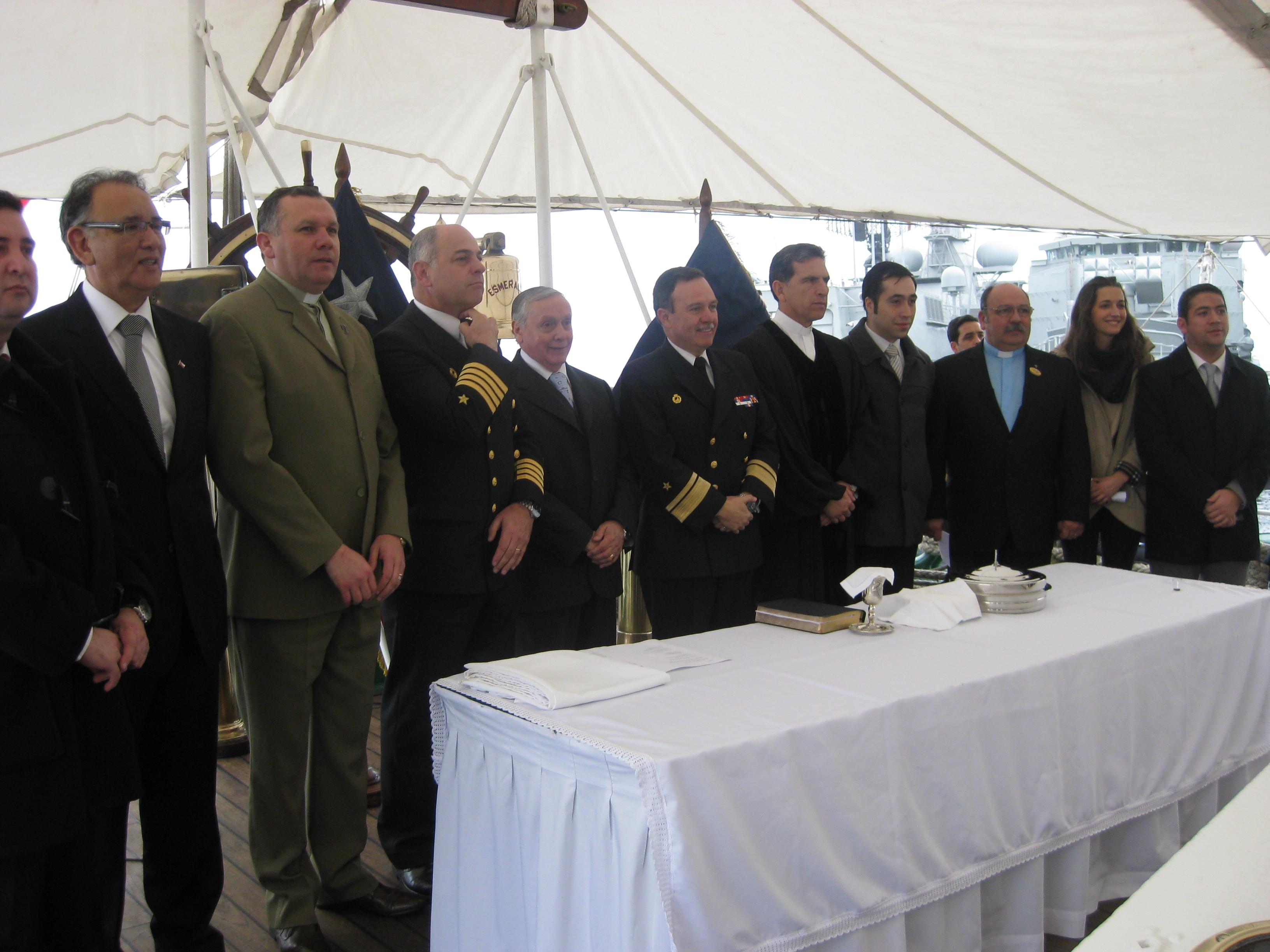 Dada la relevancia de este solemne acto, estuvo presente el Comandante en Jefe de la 1 Zona Naval, el Contralmirante Julio Leiva Molina y el Comandante del Buque, Capitán de Navío Juan De la Maza Larraín, así como distintos obispos y pastores evangélicos del país.